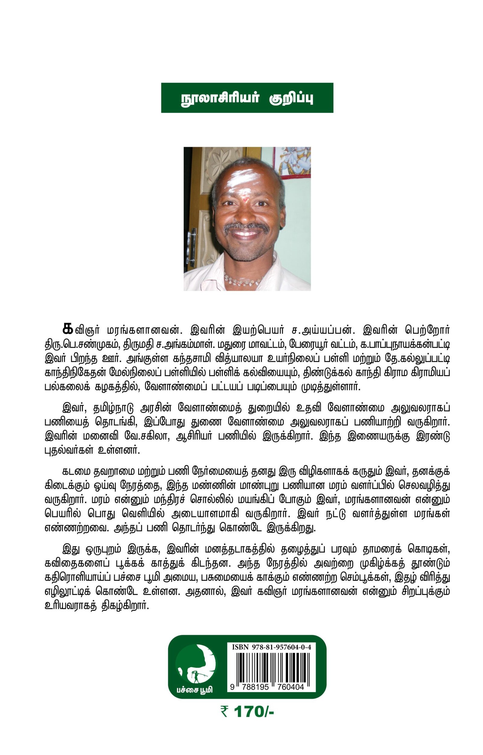 அணிந்துரை, மதிப்புரை என்று, சான்றோர்கள் சிலர், இந்நூலின் கவிதைகள் குறித்துப் பேசியிருப்பதால் நானும் அதற்குள் செல்ல விரும்பவில்லை. இந்த நூலில் இடம் பெற்றுள்ள கவிதைகள் அனைத்தும் இயற்கை சார்ந்தவை; பச்சை பூமி இதழில் வெளியானவை. இந்த இதழ் இவருக்கு உந்து சக்தியைக் கொடுத்து எழுத வைத்தது; கவிஞர் என்னும் அடைமொழியைக் கொடுத்தது. இதை இன்னும் மெருகேற்றிக் கொண்டு தொடர்ந்து பல கவிதை நூல்களைப் படைக்க வாழ்த்துகிறேன்.